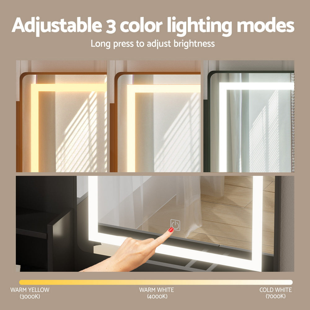Upgrade your beauty routine with this modern strip-LED dressing table set. Featuring a Hollywood-inspired mirror with built-in LED strip lighting, it offers three adjustable light modes—warm, cool, and natural - so you always have the perfect illumination for makeup or skincare. The sleek black finish pairs beautifully with contemporary interiors, while the foam-padded stool ensures comfort during use.