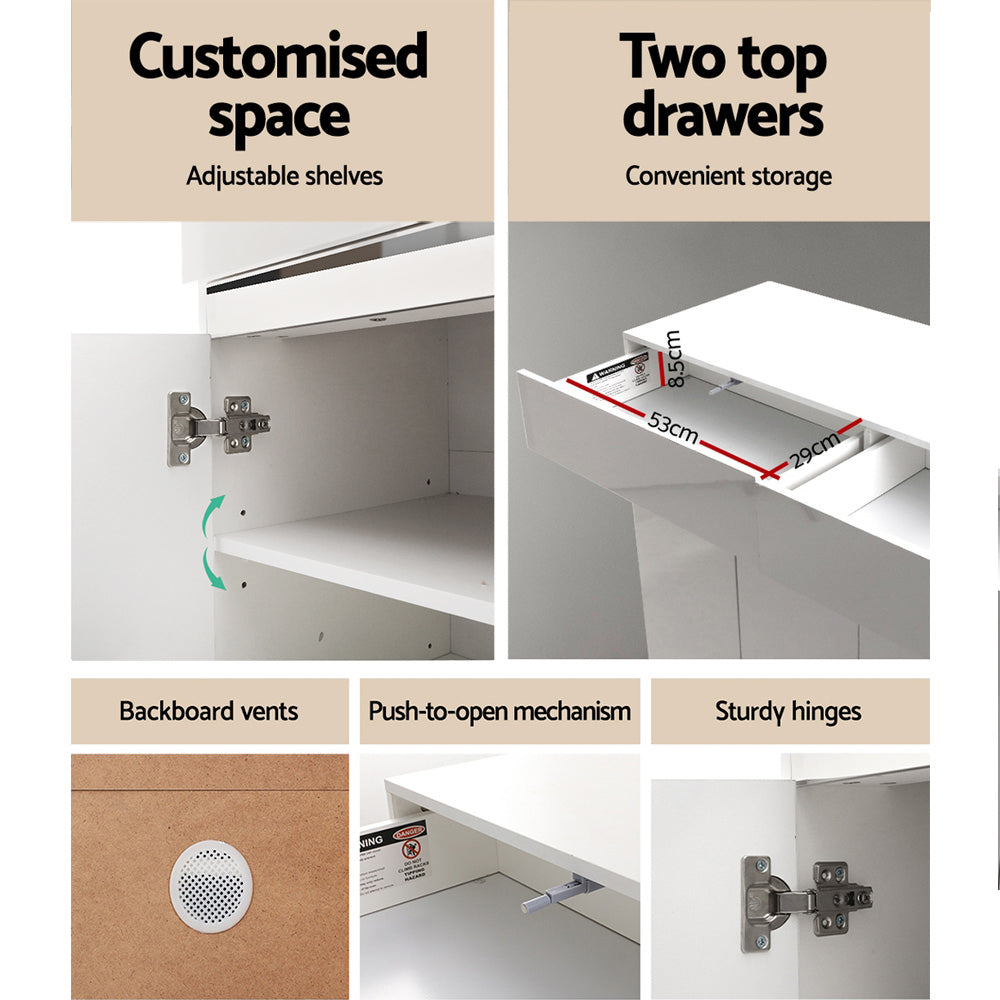 You are shoe proud. That is why you need ample space for all your wonderful footwear. And with our Shoe Cabinet, you will get all the space you need to neatly organise your shoes. Our high-quality shoe cabinet features shelves that are height-adjustable to accommodate different types of shoes and use. The cabinet has two cupboard areas of closed shelving to effortlessly house up to 26 pairs of footwear depending on size. Better still, you also get two top drawers for storing any other home essentials. Plus, the cabinet also features thoughtful backboard vents, handy push-to-open mechanism and sturdy hinges to enable the unit to stand up to robust use. Not least, the durable 12mm particle board and MDF construction, with an UV high-gloss finish on the front, make this shoe cabinet an attractive welcome to any home entrance.