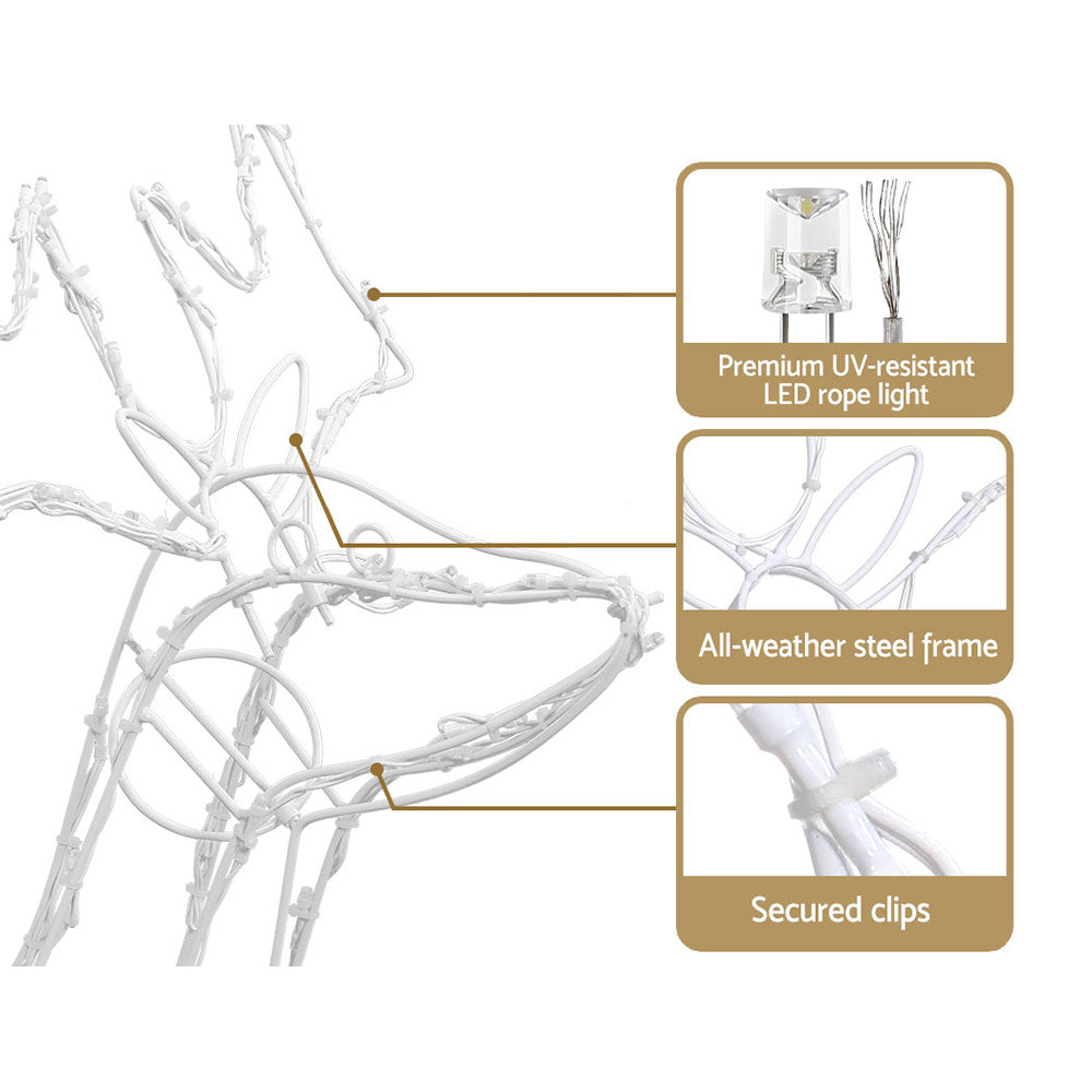 The buck’s head moves gently side to side, the doe’s head nods up and down, and the baby remains still, completing a heart-warming Christmas display. Built for durability, the set is UV and water-resistant, with a 10m lead cable providing flexible placement. Low-voltage operation ensures safety, while the bright LEDs deliver a stunning night-time glow that captures the spirit of the season.