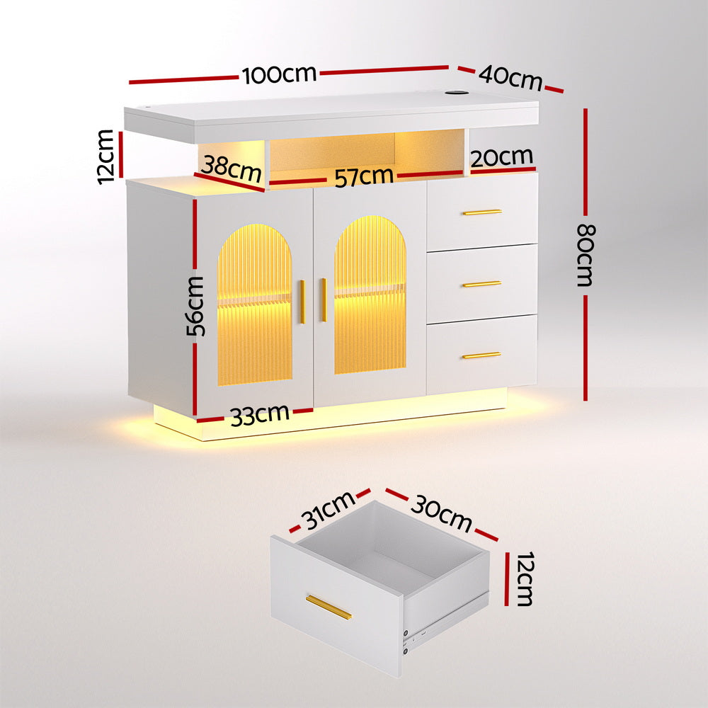 Add modern sophistication and smart storage to your home with the LED Buffet Sideboard Cabinet. Featuring a compact footprint with a spacious tabletop, three open compartments, three drawers, and a two-door cabinet, it provides ample room for dining essentials, décor, or everyday items. The sleek white finish, arched acrylic doors, and gold metal handles create a stylish statement that complements a wide range of interiors.