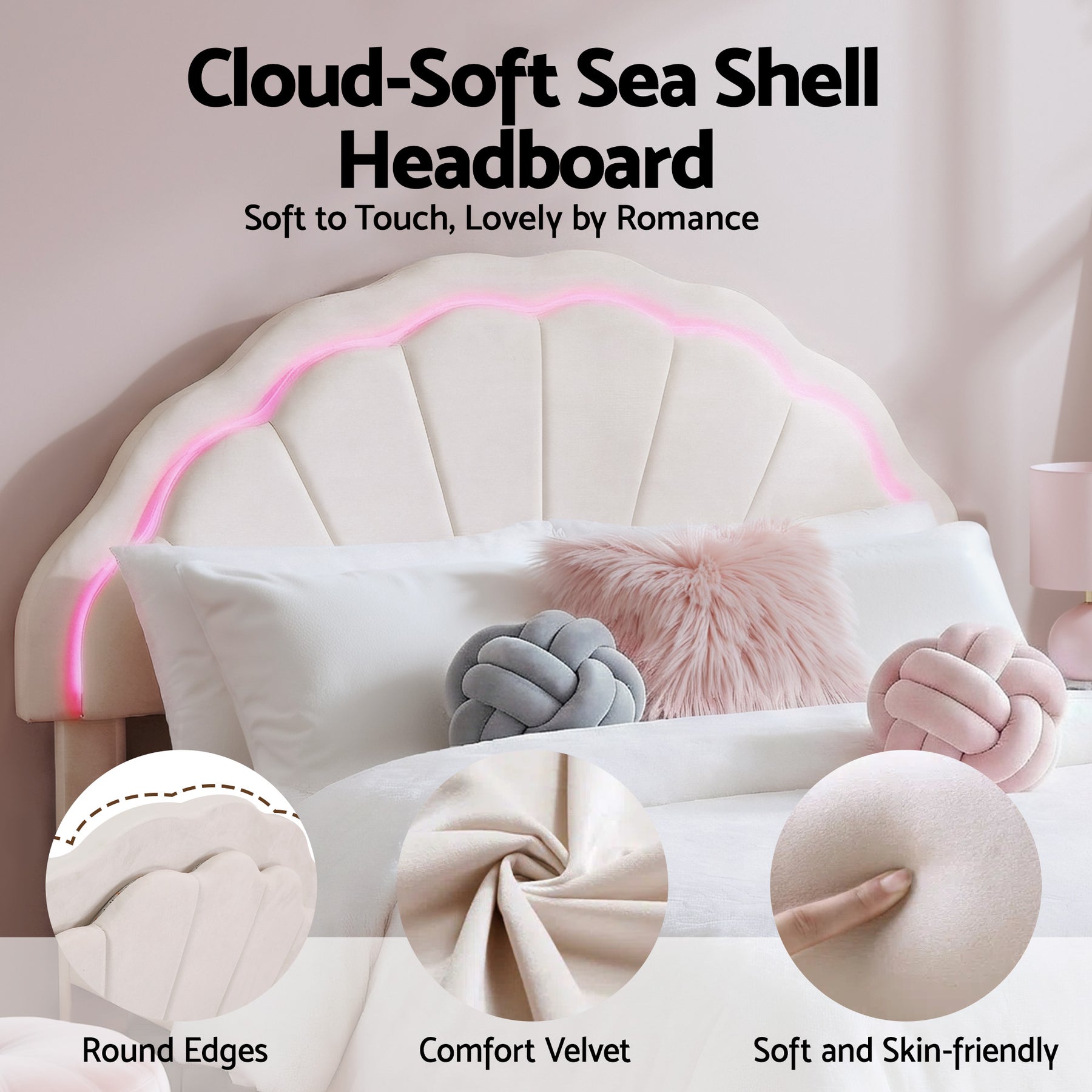 Create a soft and inviting bedroom retreat with the Coral Velvet Bed Frame. Designed with a beautifully rounded headboard and plush velvet upholstery, it offers a gentle, modern look that feels cosy and refined. The integrated LED lighting with multiple colour modes adds a subtle glow, perfect for creating a calming atmosphere at night.