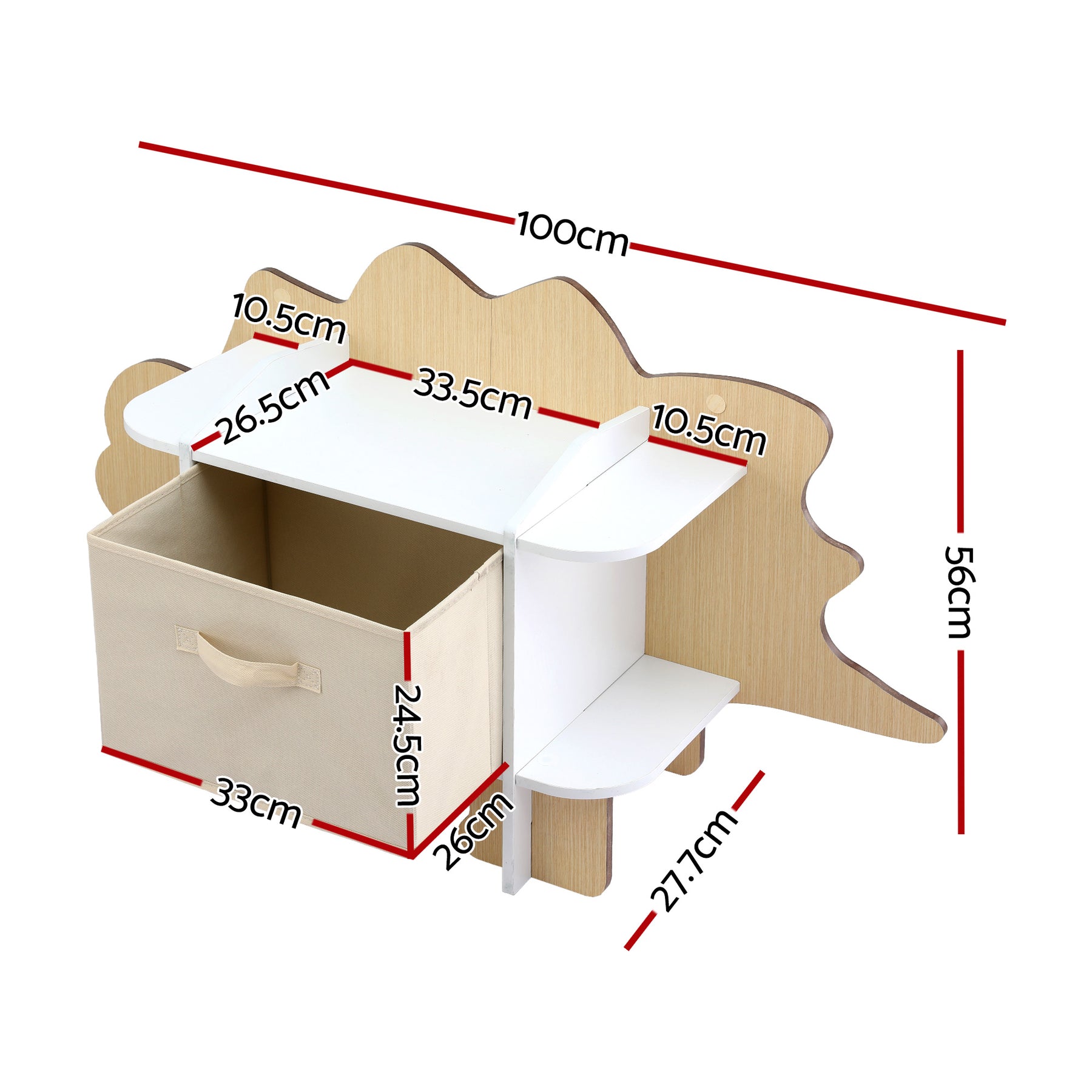 Make story time and clean-up time something kids actually enjoy with this Kids Mini Dinosaur Bookshelf with Drawer. Featuring a playful dinosaur silhouette, this kids bookshelf adds personality to bedrooms, nurseries, and play areas while helping keep books and toys neatly organised. The open shelving design makes it easy for little ones to find their favourite books, encouraging independence and helping build positive reading habits from an early age.