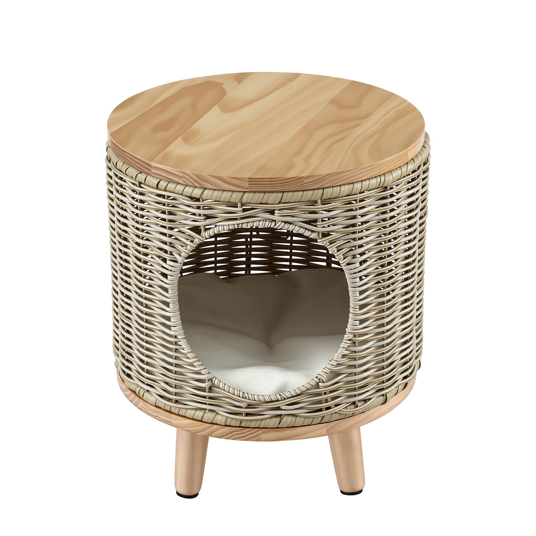 Add style and functionality to your space with this Rattan Side Table with Built-In Pet Bed, designed as a unique 2-in-1 solution for modern homes. Featuring a natural rattan exterior with a solid wood tabletop, this side table doubles as a cozy resting spot for your pet while offering a practical surface for everyday use in living rooms, bedrooms, or outdoor areas. Built with a sturdy steel frame and weather-resistant materials, it’s a durable and space-saving addition to any home.