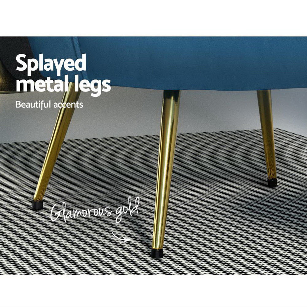 Iconic design. Timeless appeal. Our Armchair is the epitome of trendsetting style designed for the bold and passionate. With its thick padding of high resilience foam and velvet fabric upholstery, the armchair is perfect as a reading chair or a favourite relaxation seat. The vintage-style scallop shell back wraps around and hugs your body to provide perfect support and comfort. The splayed metal legs in glamorous gold give the armchair loads of character as well as providing a very stable base. Not least, the workmanship is meticulous with the fluid corners and sturdy wooden frame. The armchair will blend well with any setting from classic to contemporary and will also soften the flow of rooms with angular furniture and accents.