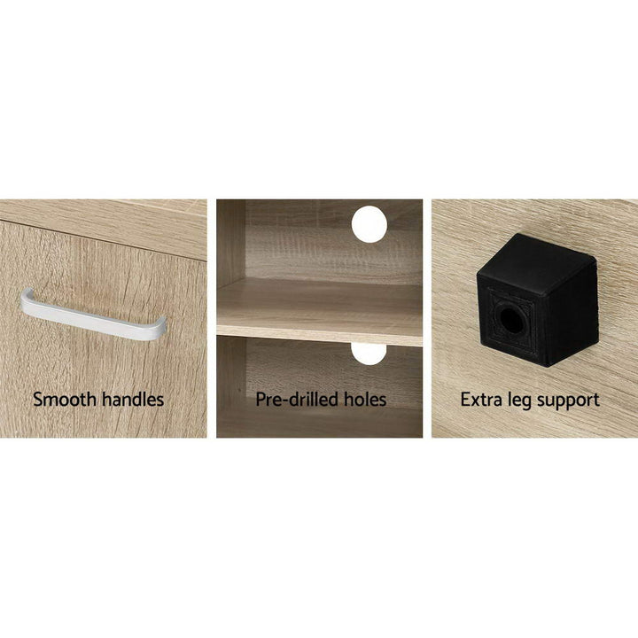 Your treasured home entertainment system deserves the best cabinet for it. And that is why our Entertainment Unit is the ideal choice for you. Incorporating a contemporary design and presented with durable and strong 30mm thick honeycomb board and 15mm thick particle board, our entertainment unit displays great craftsmanship with equally fine hardware to ensure trouble-free use every time. The natural woodgrain finish is beautiful and smooth to the touch, making the unit not only good-looking but easy to clean and maintain. And it offers ample storage space with two open shelves and two deep cabinets with magnetic door catches for all your entertainment essentials. Better still, the ensemble features smooth handles for a sleek appearance and pre-drilled holes to keep all your cables tidy. The simple and linear design means that the unit will suit any decoration and be the perfect addition to your modern living room. And best of all, you can also match with other products from the Maxi series for the complete simple-natural look.